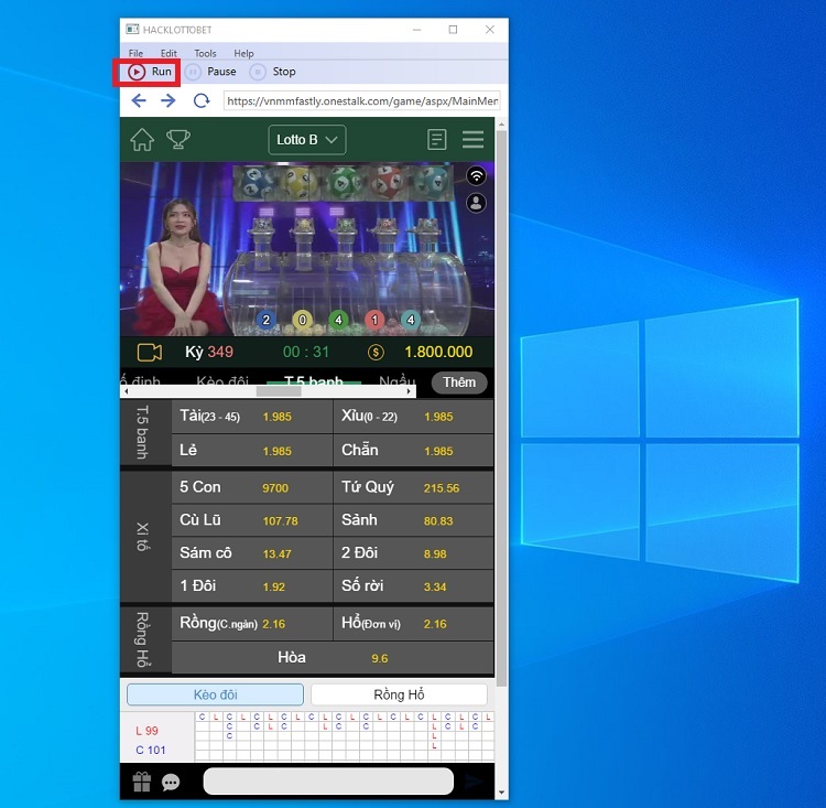 - Trước khi loto đóng cược người chơi nhấn vào RUN trên phần mềm để lấy kết quả dự đoán trước.